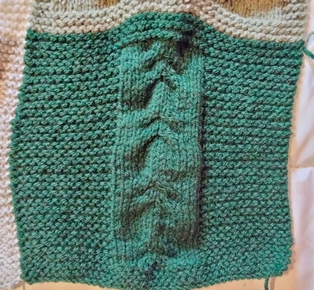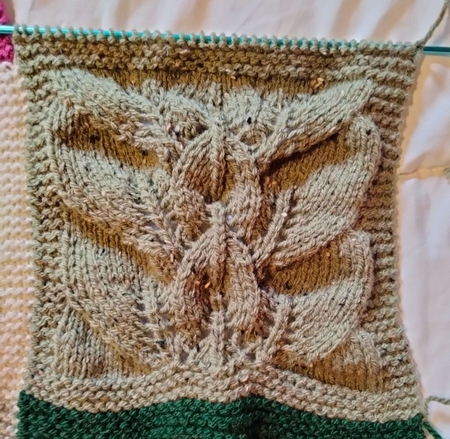 Morceau du « fil rouge 2026« 1 pelote Canada de Lammy + 1 paire d’aiguilles à tricoter n°5 ; Monter 40 mailles, tricoter 60 rangs ainsi (en fixant ce morceau sur le morceau 25 au fur et à mesure du tricotage) : 6 rangs au point mousse (= que des mailles à l’endroit) 48 rangs suivants ainsi :13 mailles au point mousse – 14 mailles au point 235 – 13 mailles au point mousse 6 derniers rangs au point mousse. Ne pas rabattre les mailles, les laisser en attente. Besoin d’aide ? Pensez au forum