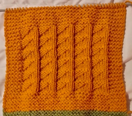 12 rangs au point mousse (= que des mailles à l’endroit)