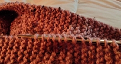 Lorsqu’on tricote la bande suivante, à chaque fin des rangs impairs on fait un surjet simple avec la dernière maille du rang et une maille relevée le long de la bordure (maille correspondant au même niveau, si on est au premier rang de notre nouvelle bande alors le surjet se fera avec la maille relevée sur le premier rang de la bande précédente, et ainsi de suite).