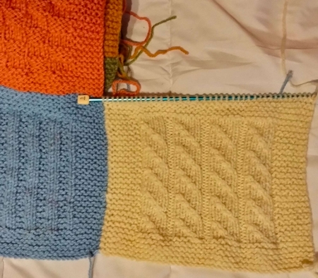 On relève des mailles le long du carré de la bande précédente en glissant l’aiguille à tricoter ainsi :