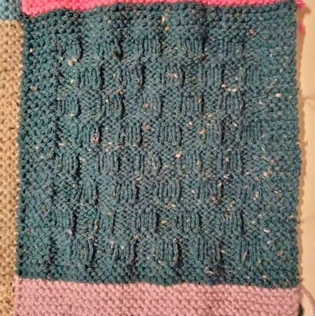 1 pelote Canada de Lammy coloris n°7 + 1 paire d’aiguilles à tricoter n°5 ; Tricoter 60 rangs ainsi : 10 rangs au point mousse (= que des mailles à l’endroit) 40 rangs suivants ainsi :8 mailles au point mousse – 24 mailles au point 0265 – 8 mailles au point mousse 10 derniers rangs au point mousse. Ne pas rabattre, les laisser sur l’aiguille à tricoter afin d’y mettre le deuxième morceau à la suite. Besoin d’aide ? Pensez au forum 😉